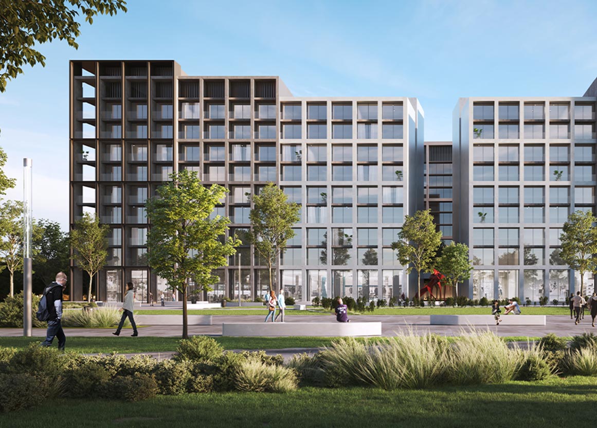 view over either a landscaped green park or the bustling the Aljada boulevard