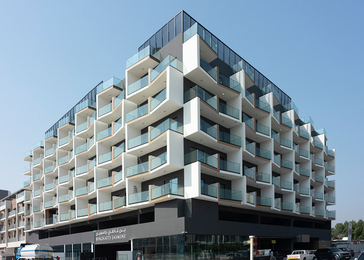 Binghatti Jasmine is a six-storey residential complex located in Jumeirah Village Circle, Dubai, by Binghatti Developers. The building’s façade was designed using white and orange tones, which is a stylistic trademark of the developer and sets the building apart from its surroundings. The complex was handed over at the end of 2022.
