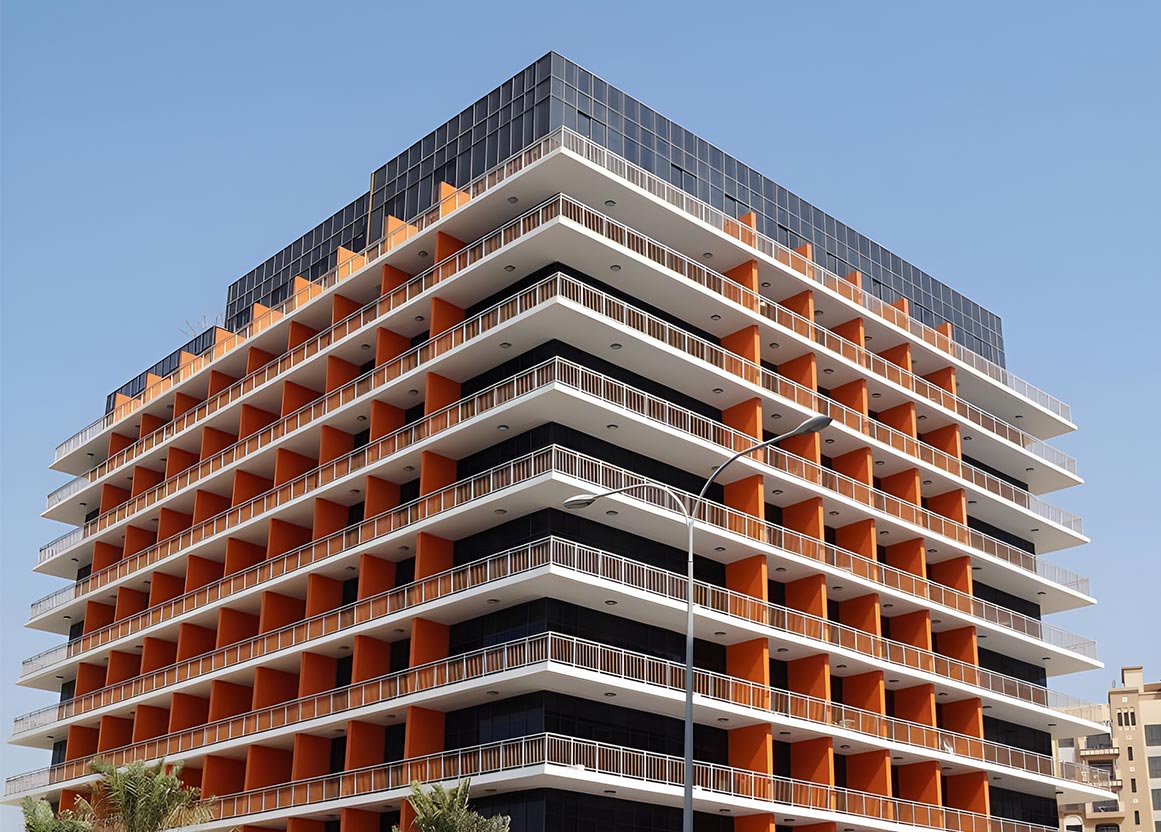 Binghatti Residences is a 10-storey residential complex located in the vibrant and family orientated area of Dubai Silicon Oasis, by Binghatti Developers. The development has a modern design, with the perimeter of the facade featuring rows of white terraces and bright orange block accents that create a unique and original style, as well as walls of darkened glass that complete the building’s architectural look.