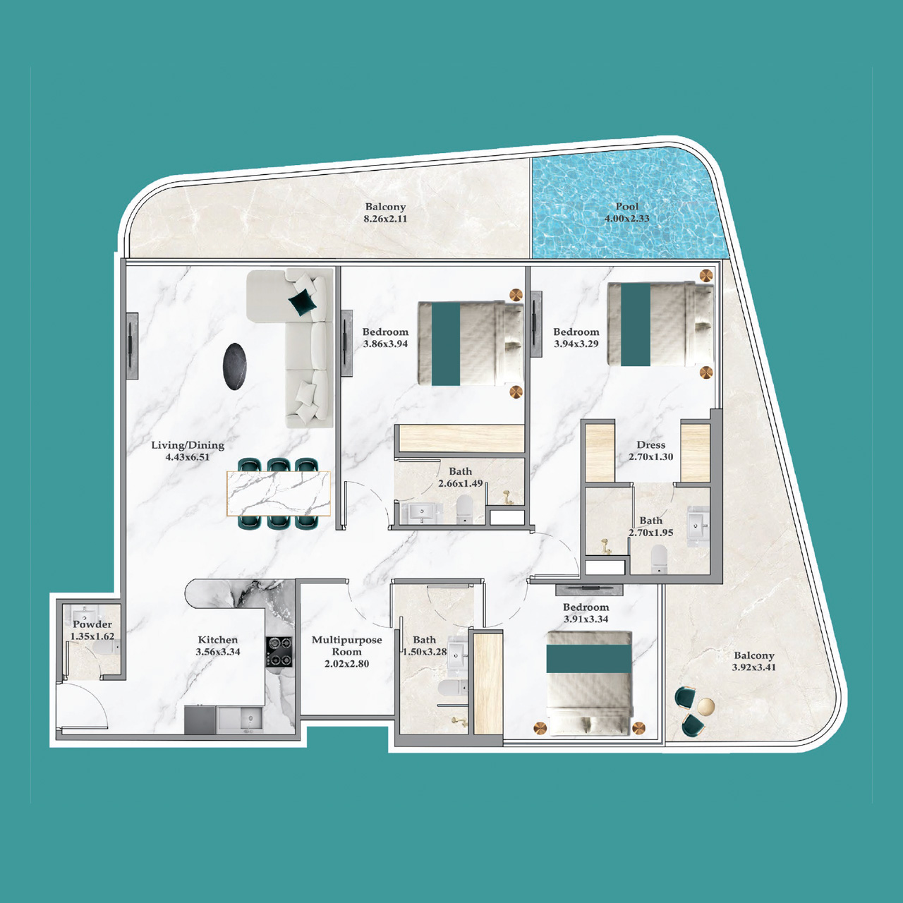 The project includes over 40 resort-style amenities, such as an infinity pool, lagoon deck, sky lounge, spa, gym, cinema, cigar bar, and multiple sports courts, along with landscaped promenades, cafés, and leisure spaces.