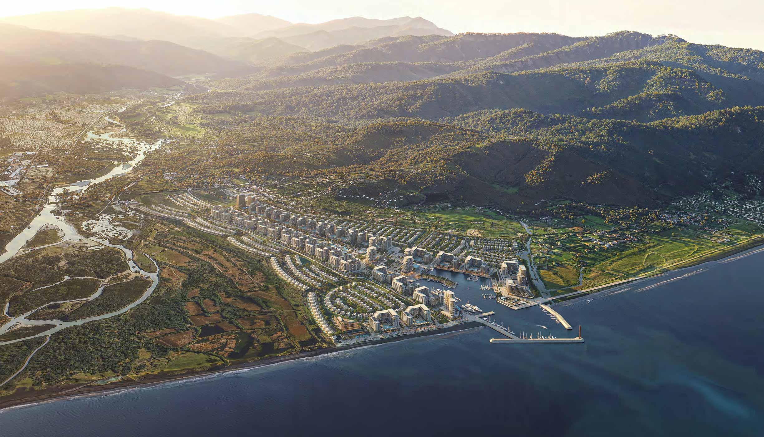 The masterplan includes waterfront apartments (1–3 bedrooms), townhouses (3–4 bedrooms), and luxury villas, each designed with panoramic Black Sea and marina views.