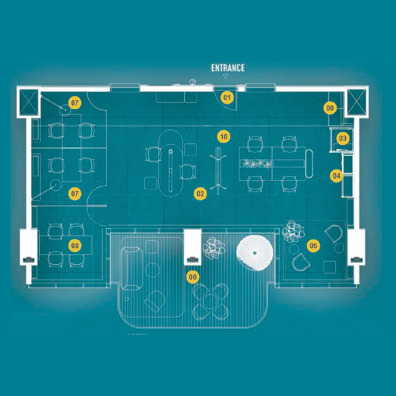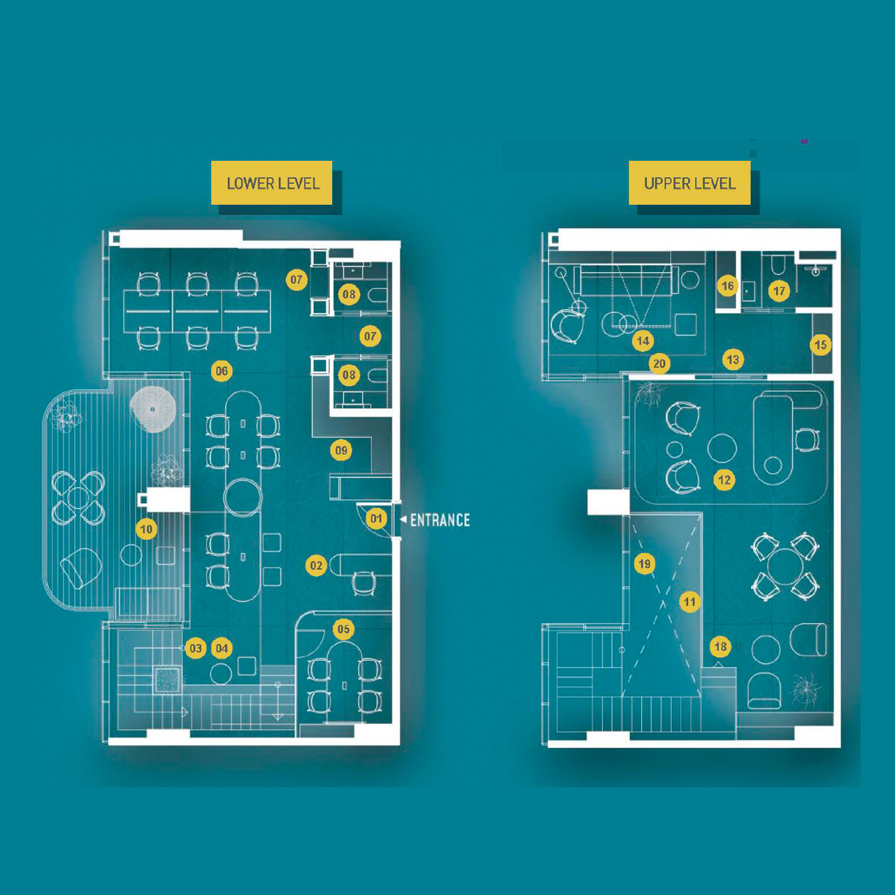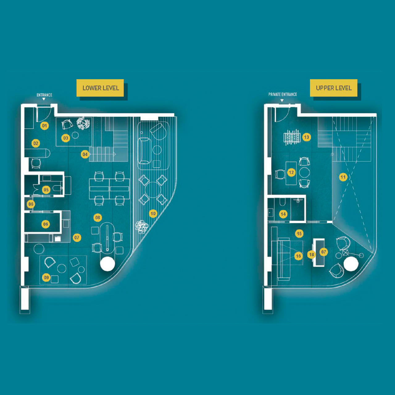 - Co-working lounges, meeting pods, and event zones