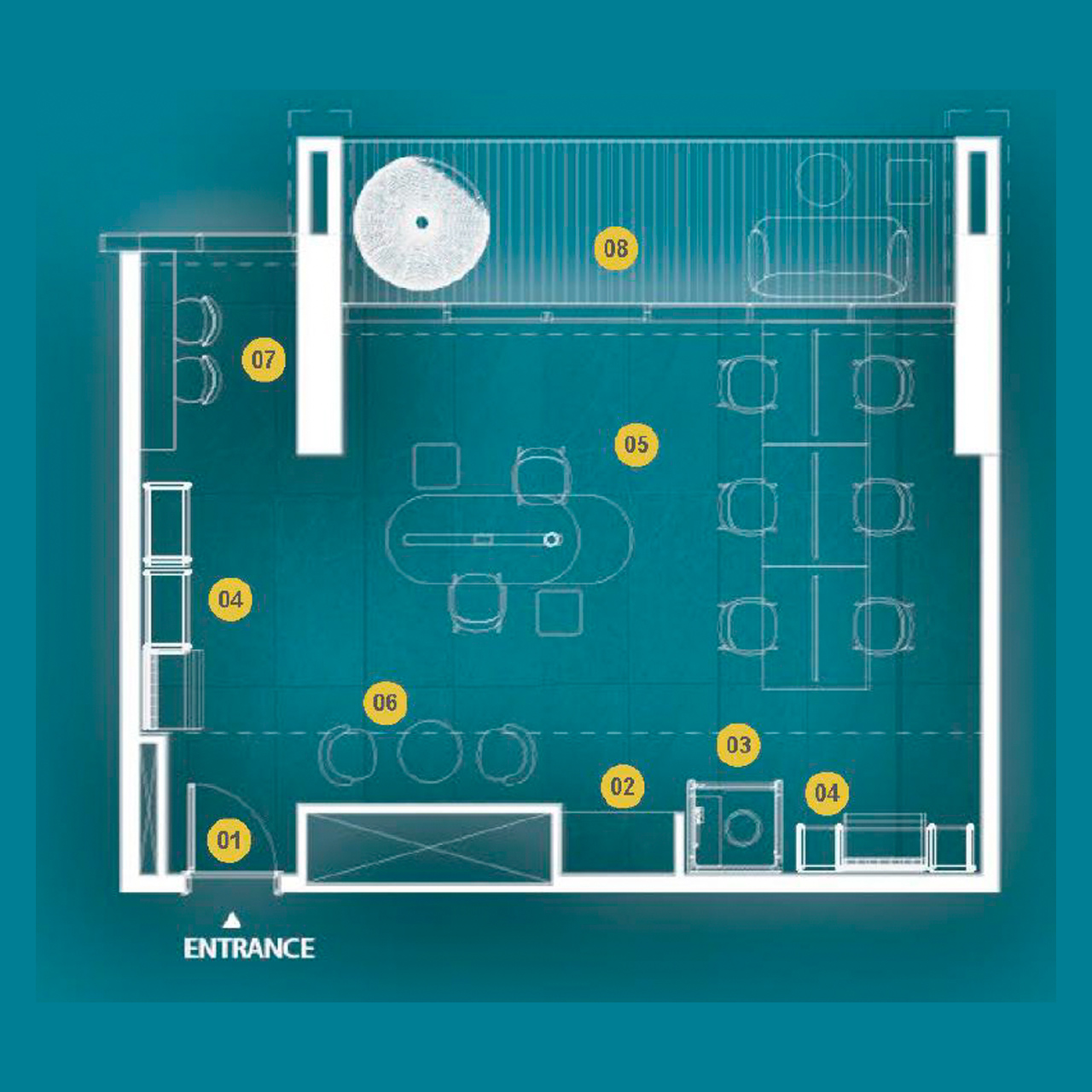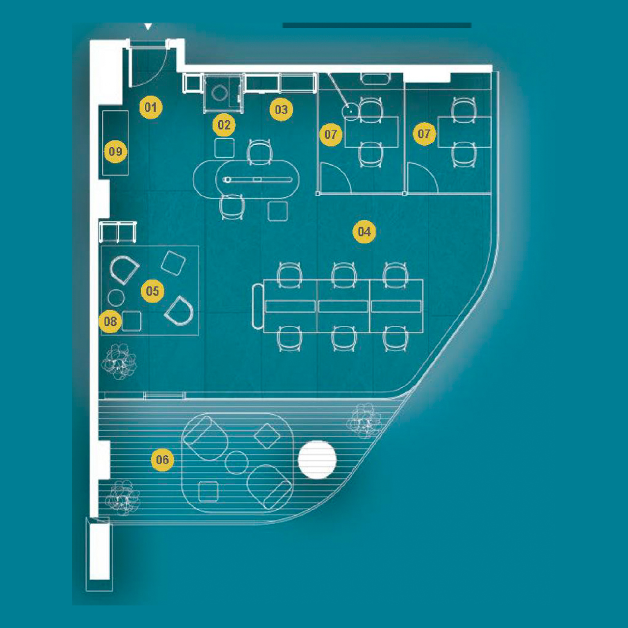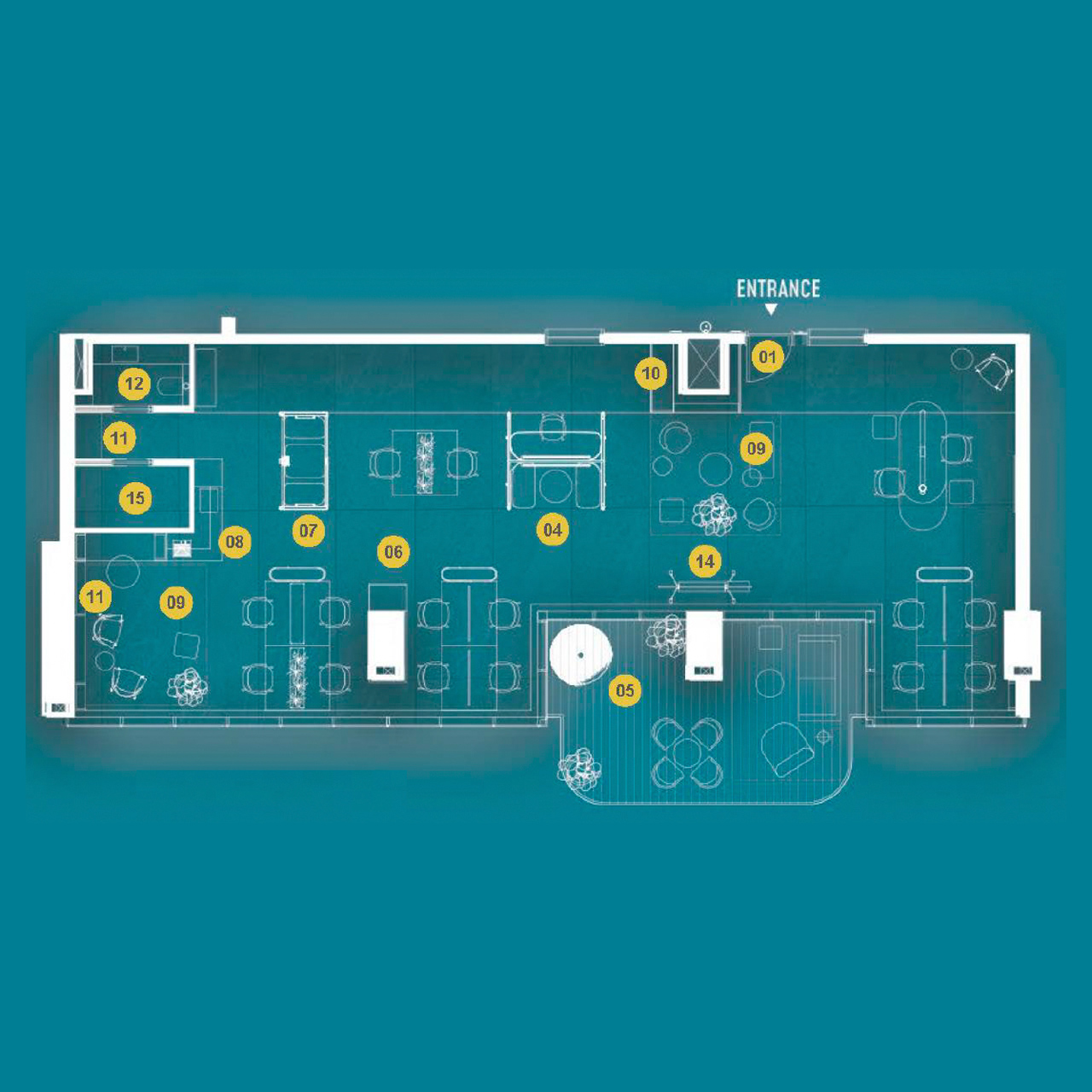 - Co-working lounges, meeting pods, and event zones