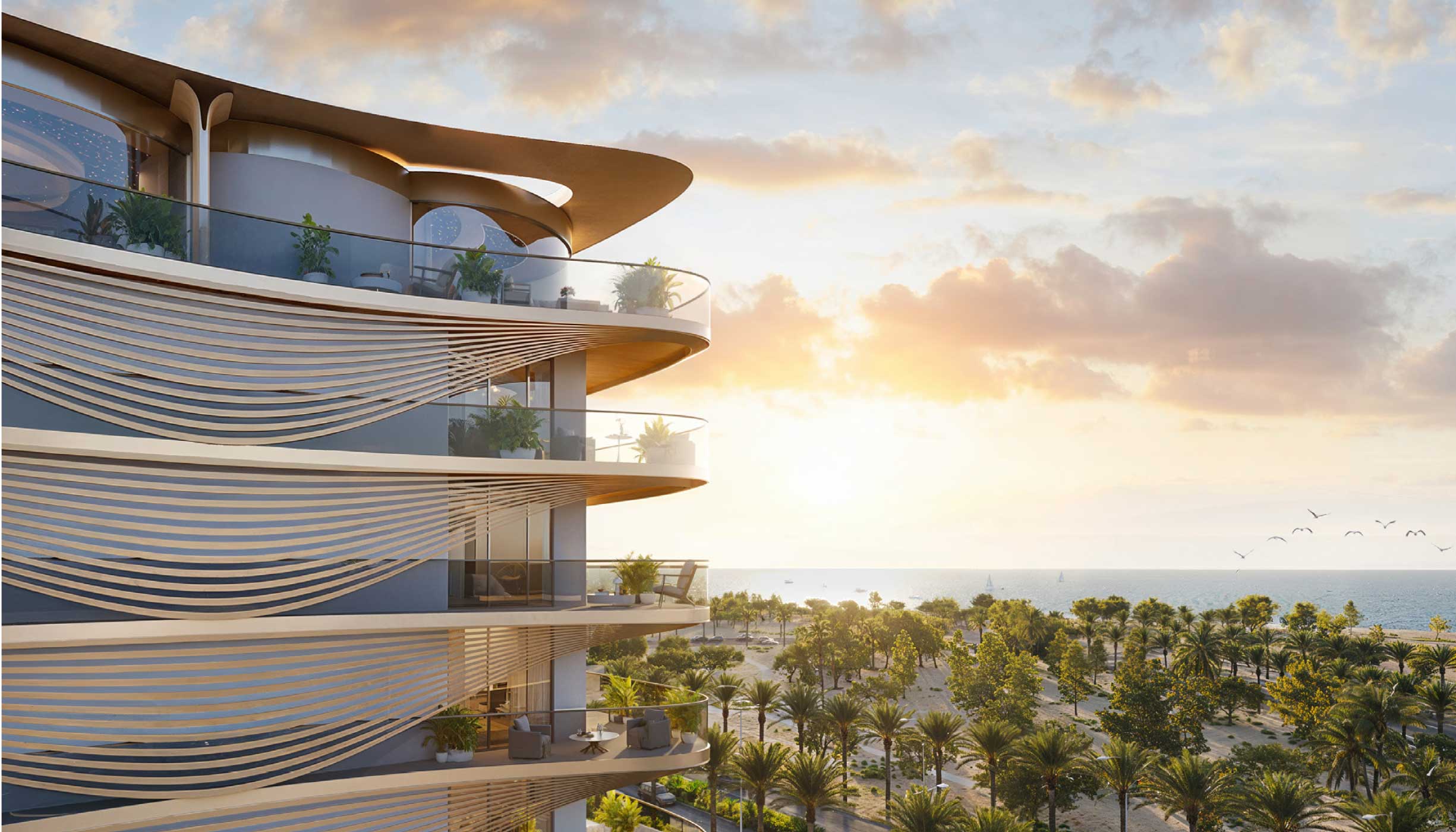 The development features 223 fully fitted studios, 1- and 2-bedroom apartments with Italian-crafted finishes, floor-to-ceiling windows, and panoramic sea or park views.
