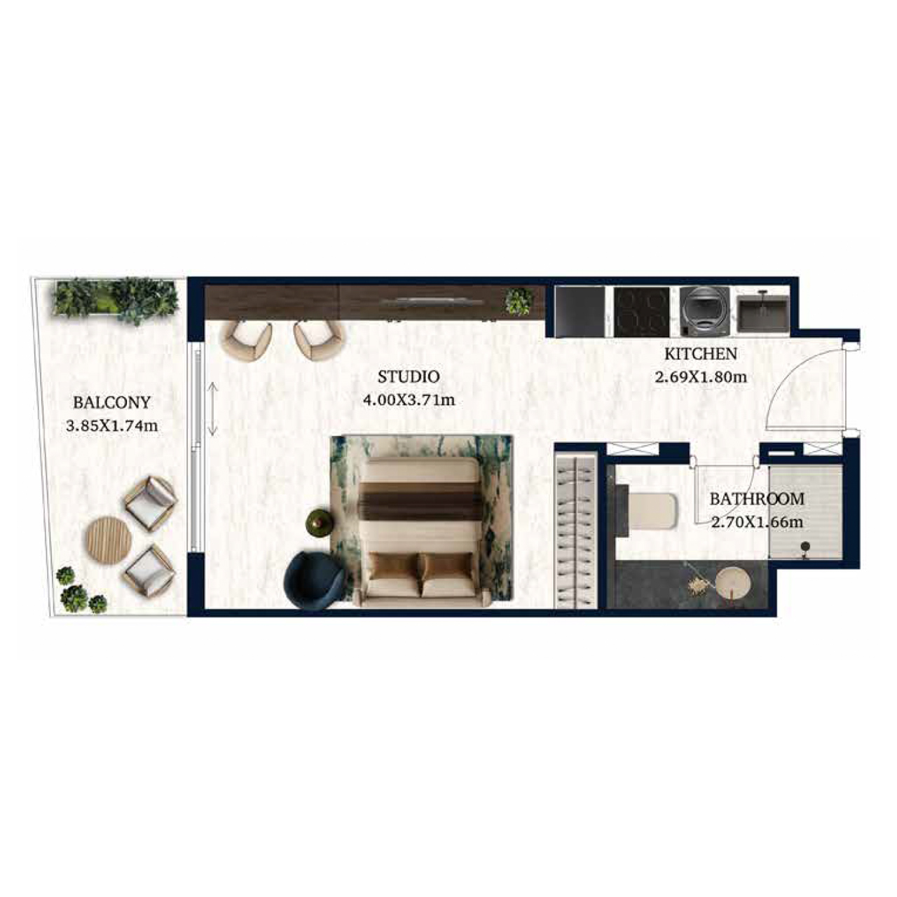 Fully fitted studios, 1- and 2-bedroom apartments ranging from 302 to 1,409 sq.ft.