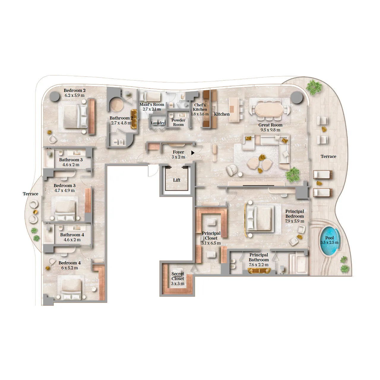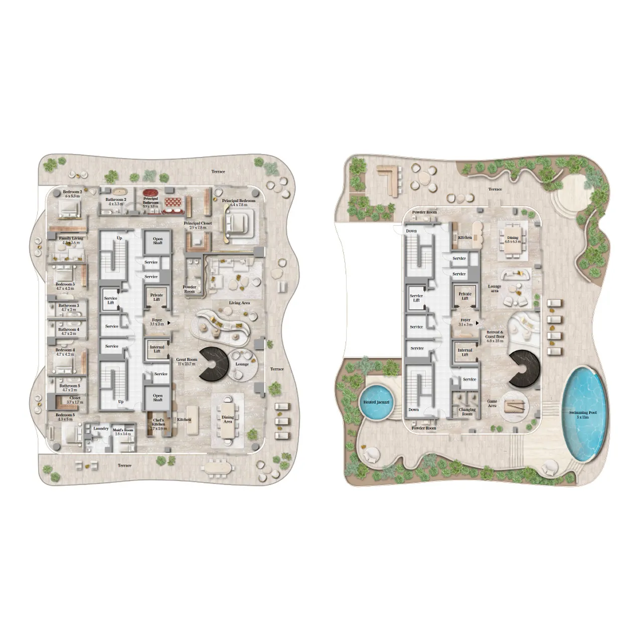 Only 25 homes, each a testament to Maison Margiela’s mastery of form and material: 2 Bedroom — 2,572 to 2,727 sq.ft.; 3 Bedroom — 3,585 to 4,847 sq.ft.; 4 Bedroom — 5,207 to 5,304 sq.ft.; 4 Bedroom Duplex — 6,743 sq.ft.; Penthouse “La Maison Blanche” — 18,804 sq.ft.