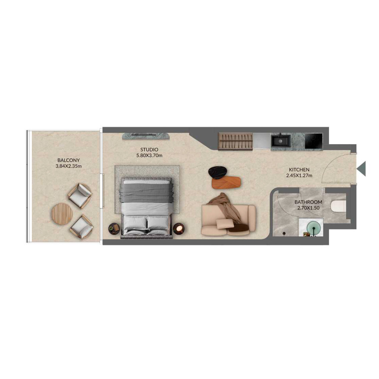 Studios start at 470 sq.ft., while 1-BR apartments offer layouts of approximately 1,000 sq.ft.