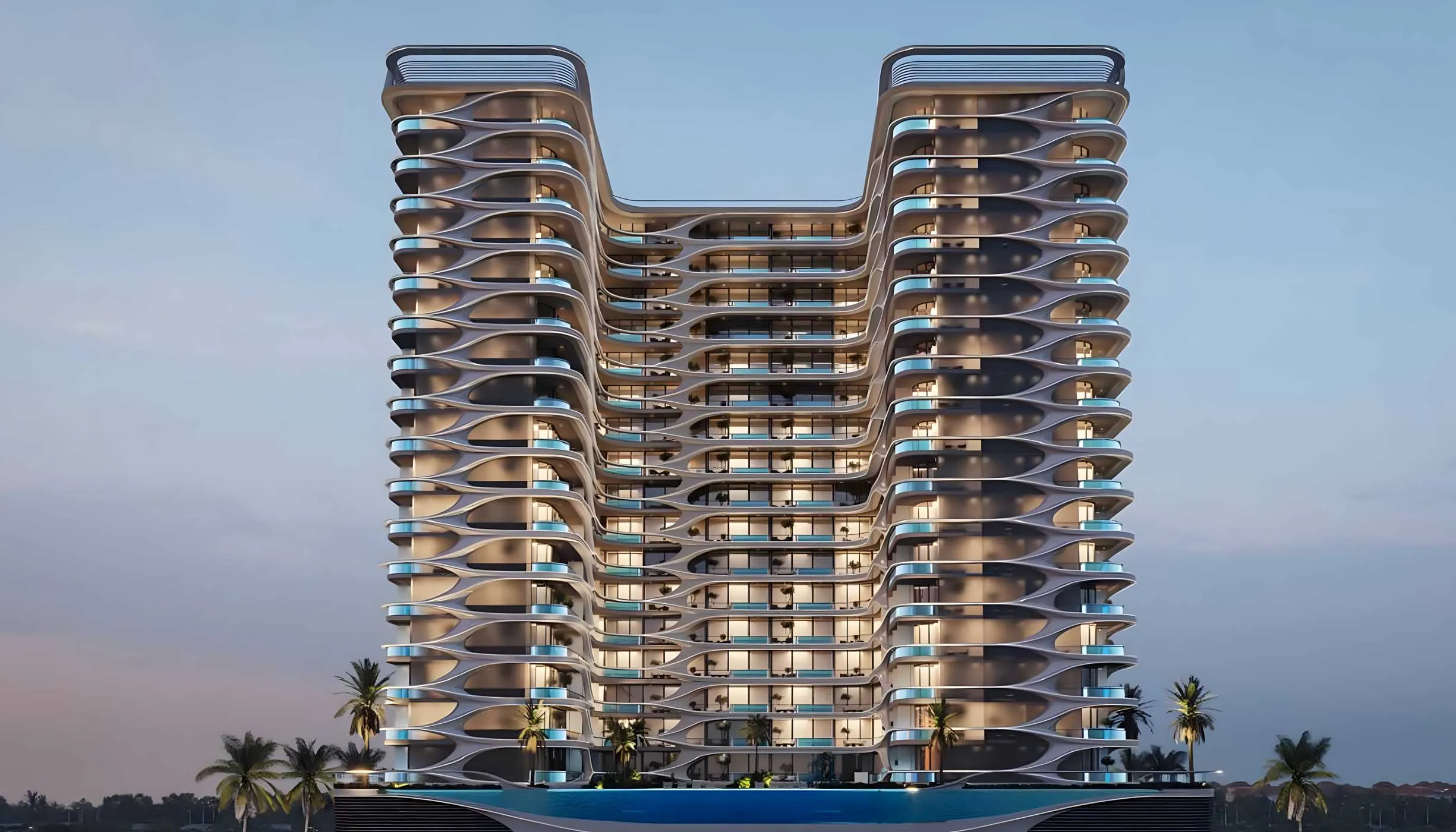 Amenities include private balcony pools in every residence, adult and children’s pools on the podium, sun terraces, shaded lounges, a fitness and wellness center, landscaped areas, and family spaces.