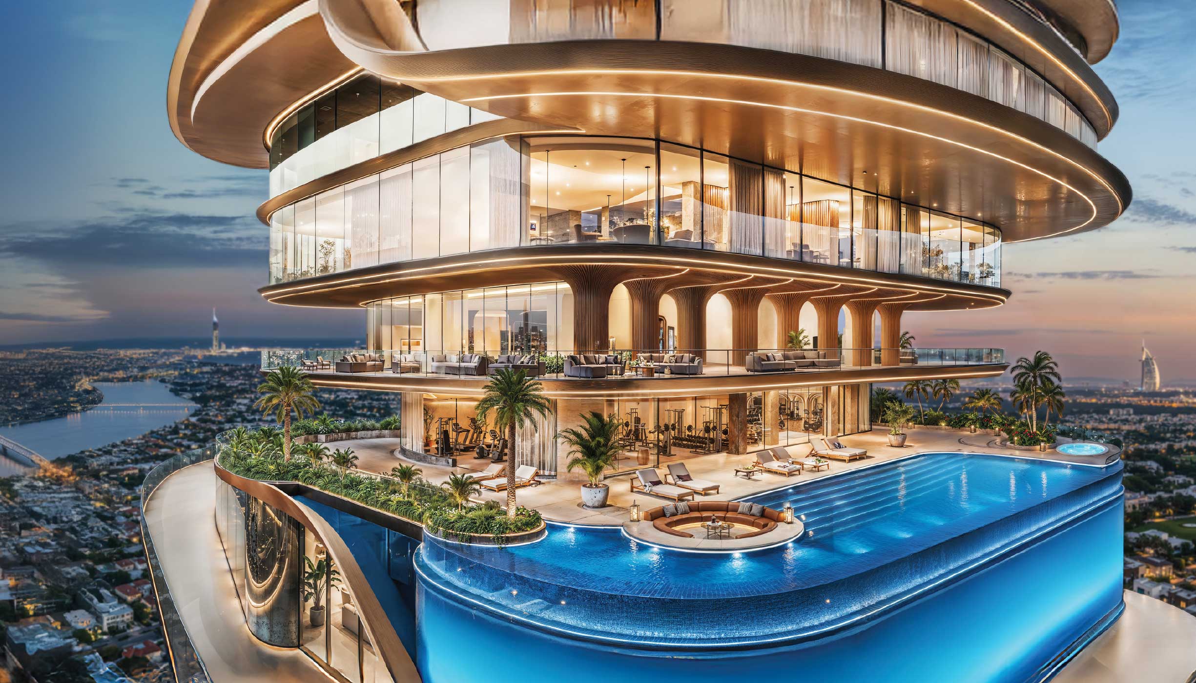 The tower includes 35+ amenities: lounges, helipad, sky pool, gym, padel court, cricket pitch, business halls, podcast studio, EV charging, scooter stations and more.
