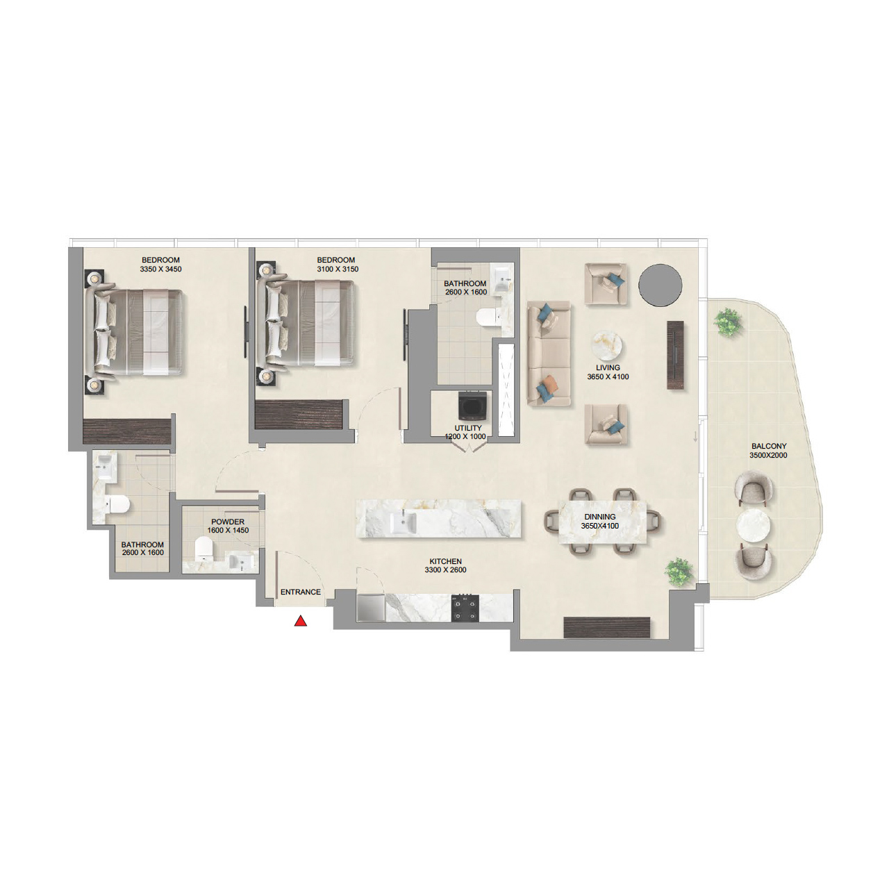 1BR apartments start from 574 sq.ft., 2BR units range up to 1,417 sq.ft., and 3BR apartments reach 1,812 sq.ft., all thoughtfully designed for panoramic Arabian Sea views and modern living.