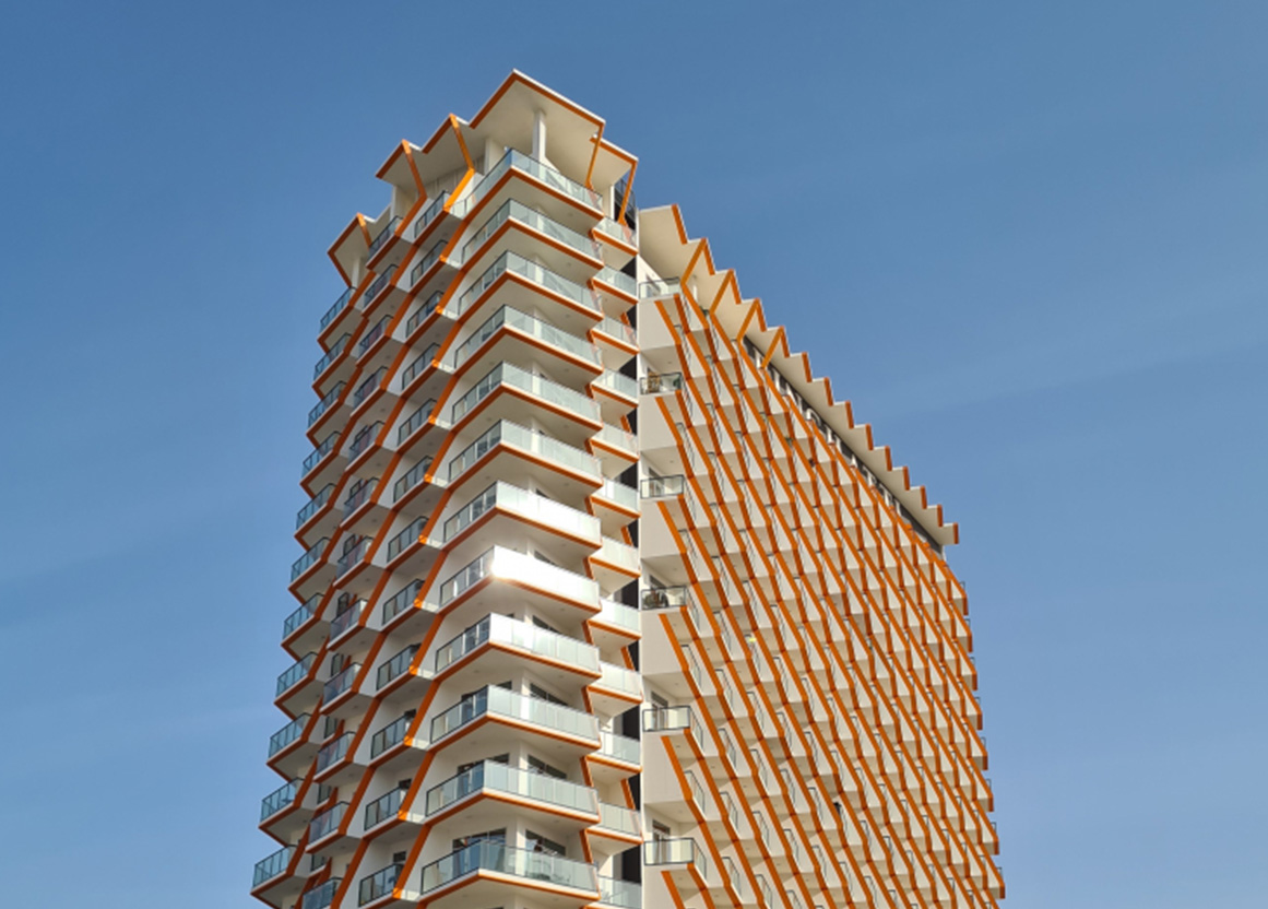 Жилой комплекс отличается интересным дизайном фасада, в котором сочетаются белый и оранжевый цвета. Такое стилистическое оформление характерно для всех проектов застройщика. Дизайн Binghatti Gateway был вдохновлен машрабией — традиционными арабскими узорными решетками на окнах, которые обеспечивают уединение, приятную тень и выступающими оригинальным архитектурным украшением.
