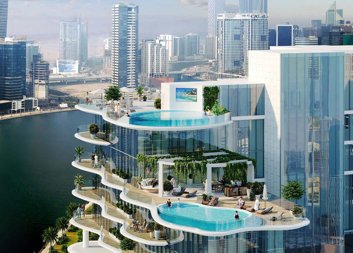 Экстерьер эксклюзивного проекта состоит из каскада волнистых террас, разработанных под впечатлением от созерцания вод Dubai Canal. Концепцию комплекса дополняет волнистая крыша, напоминающая слои горной породы, где вода перетекает из одного бассейна в другой. Еще одно преимущество Chic Tower – панорамные окна, из которых открывается захватывающий вид на набережную Dubai Canal.